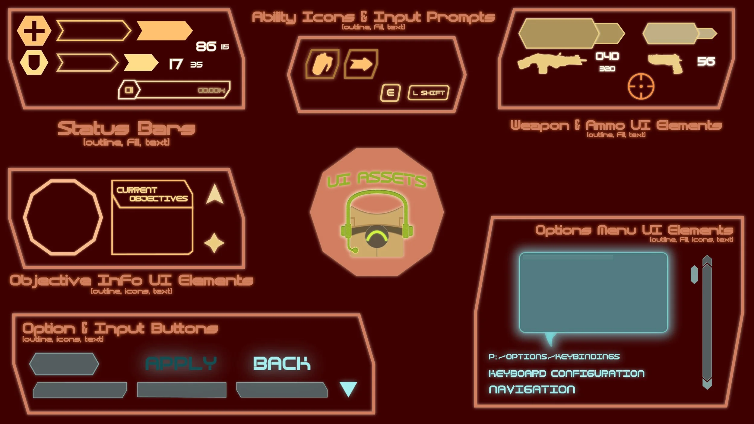 For this art test, I was tasked with creating all of my assets inside of a vector graphics editing software of my choice (I went with Adobe Illustrator for the creation of all of these assets) and implement the assets I created onto a set of provided images as well as develop an asset sheet to show off each and every one in detail. Majority of the assets only required some simple shape blockouts, but for some of the specifications that I wanted to include (mainly weapon and ability icons), I ended up finding specific objects that fit my vision and tracing them by mouse (which is in my opinion easier than it sounds, especially if you have the DPI settings to support it!).